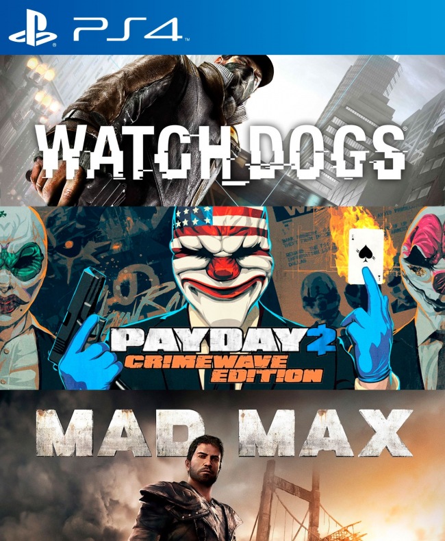 El pack incluye: - WATCH DOGS PS4 - PAYDAY 2 CRIMEWAVE EDITION PS4 - MAD MAX PS4 Pesos de los juegos : 63 GB Requerido en consola : 70 GB Instalación : 1 consola